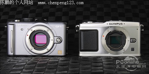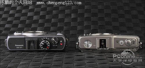 松下GF1长119mm、高71mm,奥林巴斯E-P1长120.5mm、高70mm,从上图也可以看出,其实两款相机的大小相差不了多少,E-P1的机身线条更流畅,显得比GF1要修长,但实际上1mm的差距完全可以忽略不计。松下GF1显得粗犷一些,按键、拨盘等等外露。