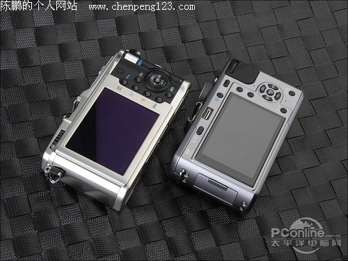 翻到背面可以拿来比较的只有显示屏了,两款都是3英寸的大小,但是松下GF1为3:2的比例,更接近单反的设定。而奥林巴斯E-P1则保持了4:3的比例。另外松下GF1的显示屏分辨率达到了46万像素,要比E-P1的23万像素好太多太多。使用过就知道,3英寸23万像素的液晶屏,对于使用这种级别相机的人来说,是无法容忍的。