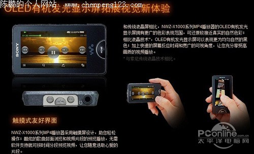 索尼NWZ-X1050配备了3英寸全触摸液晶显示屏,屏幕分辨率是432×240像素。屏幕材质为OLED有机发光显示屏,因此在色彩效果方面的表现非常优秀。和传统液晶屏相比,NWZ-X1050的OLED屏拥有更广的色彩表现范围,可还原较接近真实的自然色彩;相比索尼传统的液晶技术,OLED屏可以表现更为均匀自然的黑色;加上快速的屏幕反应时间和宽广的可视角度,可以令人充分享受高画质的视频播放。