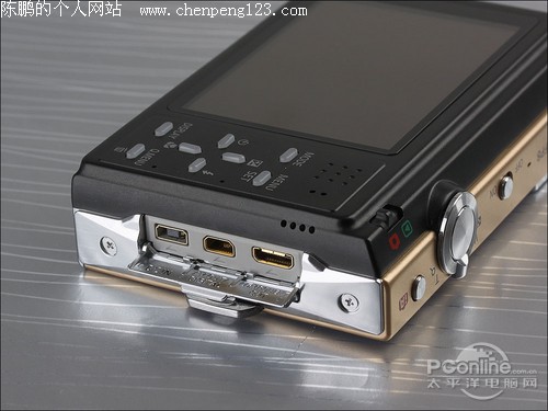 松下FP8的接口比较丰富,不过并没有配备HDMI高清输出接口,三个接口从左到右分别是电源接口、AV视频/数据接口、色差视频输出接口。
