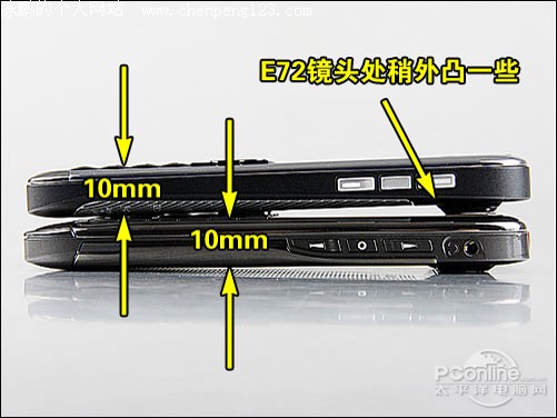 之前一直担心诺基亚E72的机身厚度会跟E63一样略有增加,不过事实证明还是保持了10mm比较薄的机身。但是可能是由于摄像头升级到了500万像素需要更多空间的原因吧,E72的摄像头部分会比E71更外凸一点,还好不是很明显。