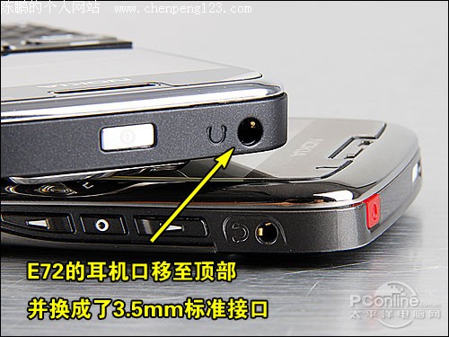 诺基亚E72还在一些细节上做出了改动,像是耳机接口移到了手机的顶部,并从E71的2.5mm接口改成了标准的3.5mm标准接口了,算是一项不错的改进。另外E72还是有其他细节变化,像是扬声器改到背面摄像头旁边,而侧面的三个侧键也增加了背光灯,夜间里不必再摸黑操作了。