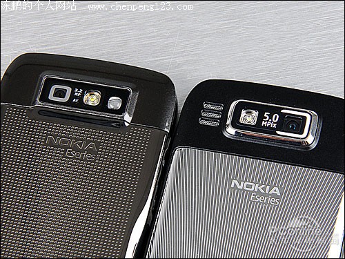 诺基亚E72相比E71另外一个重大的升级就是在摄像头了,从原来的320万像素升级到了500万像素,不过还不是诺基亚常见的卡尔·蔡司认证镜头。从下面的对比图我们也可以看到,诺基亚E72的摄像头设计与E71相比略有改动,不过功能还是一样,配备了LED闪光灯,当然还有前置的摄像头。