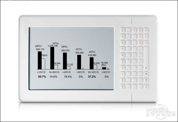 iriver story使用了6英寸电子墨水(E-ink)技术显示屏,分辨率为600×800像素,8级灰阶,文字、图片显示清晰柔和。虽然不支持触摸屏操作,但是通过键盘操作依然可以轻松上手。