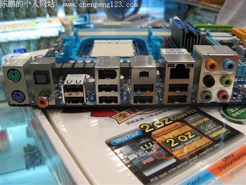 主板I/O接口部分,提供了常见的PS/2键鼠接口以及8个USB接口,另外提供了S/PDIF和同轴音频接口,2个IEEE 1394接口。
