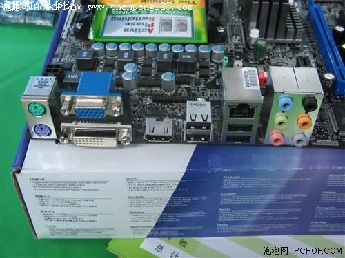 背板I/O接口部分提供了支持高清输出的HDMI接口,以及DVI+VGA接口,另外还有常见的PS/2键鼠接口。同时提供了4个USB2.0接口,千兆网络接口和音效输出接口。