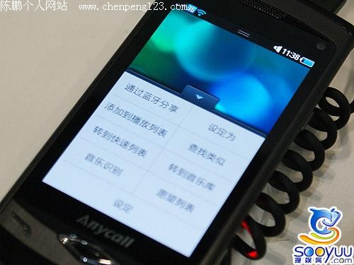 三星S8500的音乐界面非常绚丽,可以显示专辑的封面或者系统自带图案,在播放界面上下都是可以进行滑动拖拉的,用手指从上边缘向下滑动可以看到一个下拉菜单,可以选择WLAN\蓝牙\以及静音。 而在界面下方有一个小箭头,拉上来之后有很多功能选项。比如通过蓝牙分享、设定为铃声等等。