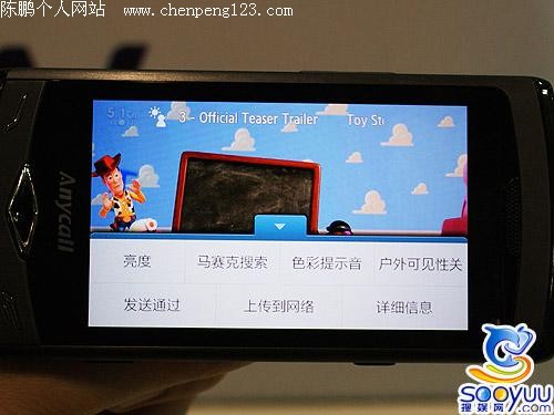 在功能方面播放视频的时候可以对手机的冷暖色风格、亮度等内容进行调节,也可以将视频随上 上传至网络。增强了S8500的互动性能。