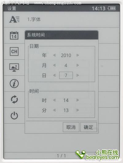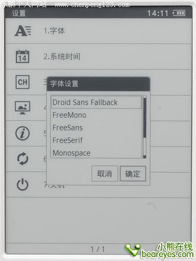 系统设置方面,欣博阅G5并不复杂,支持字体设置、系统时间设置、语言、待机时间、系统信息等调节选项。
