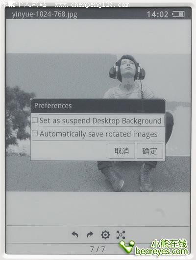 欣博阅G5支持JPG、BMP、GIF、PNG图片格式,测试部分我们采用的JPG图片格式进行测试,在图片浏览中可以通过功能键来切换横竖屏的显示,不过屏幕的表现力很一般,大家可以注意到图中人物的脖子部位细节有一些丢失,层次感及过渡感不够丰富。