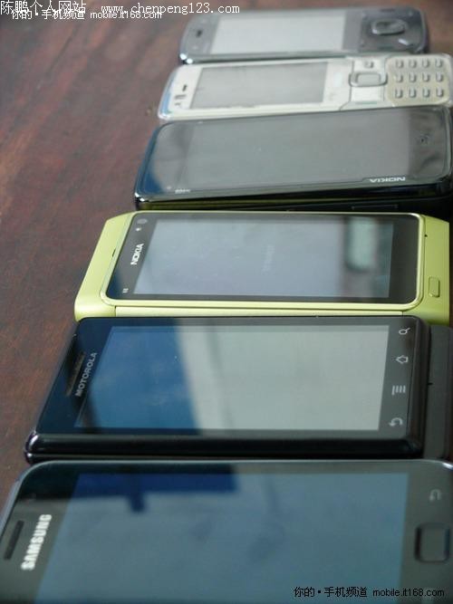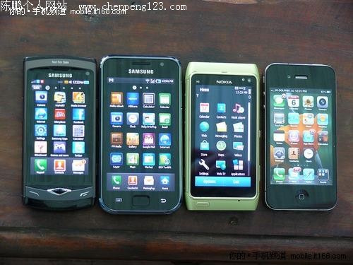 从左至右:三星S8500、三星i9000、诺基亚N8、iPhone 4,阵容好强大啊~~