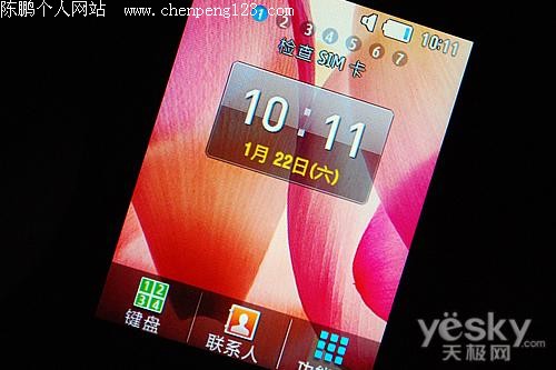 三星C3300K虽然仅配置一块2.4英寸TFT屏幕,但支持全触控操作,很多人可能会担心这款手机的触屏面积较小,留给人们手指挥舞的空间不足,但是经过实际测试发现,该机触屏反映精准,弥补了屏幕面积不足的问题。即使不用大幅度挥舞手指,同样能做到“指哪打哪”的效果。而在屏幕的显示效果方面,三星C3300K并不是非常理想,虽然屏幕发色和QVGA分辨率的搭配比较到位,但由于屏幕材质问题,色差造成屏幕显示效果略有些恍惚的感觉。不过用于文字阅读、图片查看还是没有问题的。