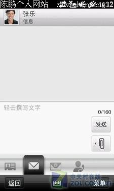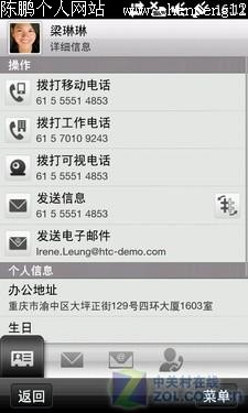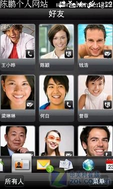 联系人界面是很多朋友经常使用的,在而HTC将联系人放在了第二主屏上也可以看到HTC对社交理念的重视,同时Sense界面直接支持大头贴显示,并且可以一键短话或者短信。打比方说,如果你和朋友A经常短信联系的话,可以直接设置一键发短信,而B经常打电话就可以一键拨号,非常的人性化。