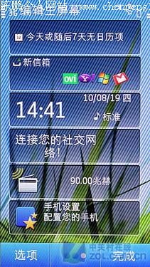 如果你不习惯使用滑锁的话,塞班3的解锁方式有小改变。不同于C6的滑动解锁,直接短按一下就可以解锁屏幕了。而之前所说的三分屏的桌面,具体指的是,也可以选择单屏桌面,但分屏的话最多只有三屏。每一屏内包含6个区域,用户可以根据自己的使用习惯,添加或删除小插件,还需要指出的是,C7的多分屏是支持无限循环的。