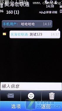 诺基亚C7支持普通的拼音、以及手写两种文字输入方式,这些并不稀奇。关键是C7和N8一样,同样加入了对话聊天式的短信界面,相比枯燥的收件箱、发件箱要美观一些。
