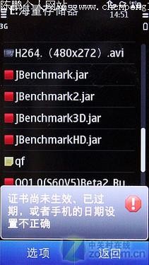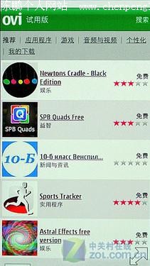Ovi商店、Ovi地图、Ovi音乐,这三个可以算是诺基亚标志性的扩展性应用了,因此在C7上出现也不足为奇。由于目前这部诺基亚C7工程机,对于S60 V5的软件兼容性不是很好(尝试修改系统时间、签名软件都无效),所以我们选择从Ovi商店下载免费的应用程序。当然这个问题,在C7以及N8正式开卖前会得到解决。