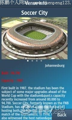 这款“2010年南非世界杯”在之前的南非世界杯赛事期间成为球迷们的观战必备工具,由顶尖的英国智能手机应用程序开发商Mubaloo开发,排名 第四位。2010年南非世界杯游戏含有所有比赛的信息(时间、城市、球场和实况进球)、国家和球队信息和数据、球员档案、球场信息和形象等。用户还可以查 询他们最喜欢的国家、球员或球场,十分便捷。
