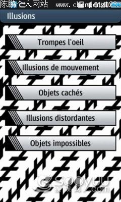 该程序可以让用户欣赏多种图像幻境(运动幻觉、时隐时现的物体、奇异线条和扭曲变形)。在选定类别后,用户可以通过点击屏幕旋转图像。