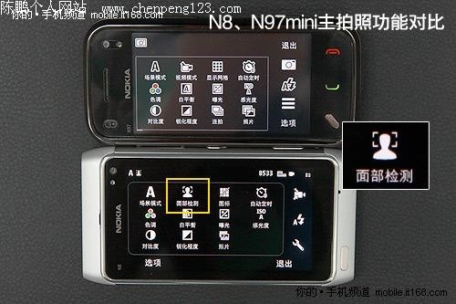 拍照方面,诺基亚N8和N97mini的界面风格同样没有实质性差别,不过N8增加了720P功能选项,并在辅助选项里加入了流行的面部检测功能,而省去了不太实用的连拍功能。