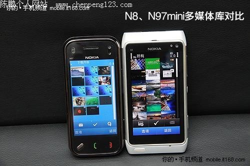 两款手机的图片和视频界面体现了“简单而粗暴”的实用主义风格,N8借助AMOLED屏幕的绚丽效果将N97mini远远摔在了身后。