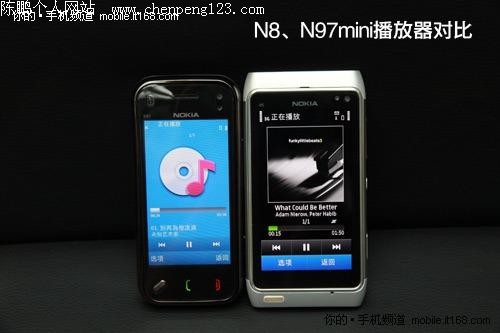 接下来我们看到的一组照片为Symbian^3与S60第五版之间的多媒体功能对比。其中在音乐播放器方面。两个系统平台都支持唱片封面显示,但N8提供了像iPhone一样的封面预览图滑动检索功能,在下面的视频中你会看到。