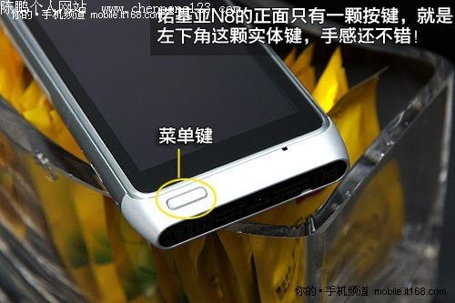 N8的菜单键位于机身底部左下方,这是一颗实体按键,采用了长条形设计,比N97、N97mini的菜单键大了不少,自然手感也有所提升。值得一说的是,在运行某一程序时,按下菜单键后屏幕将跳到主屏界面,而非菜单界面,有点让人意外。