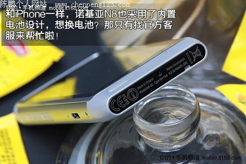 诺基亚N8在机身底部没有安排任何接口,只标注了手机的型号和产地等信息。不过需要特别指出的是,这里是没有任何机关让你打开手机后盖的,想换电池?新手上路的话还是指望客户服务帮你的忙吧!