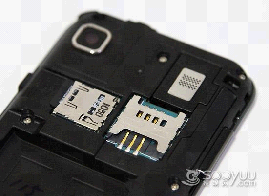在电池仓的顶部是三星i9008的SIM卡卡槽以及microSD卡的卡槽,本机支持G网中国移动或者中国联通的SIM卡,而中国联通任意号段的卡放入手机都会直接支持TD-SCDMA的3G网络,很“嚣张”。而储存卡方面三星i9008也是支持热插拔,更换时更方便。