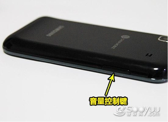 在机身的右侧顶部相对应的位置是i9008的电源键/解锁键。这两个按键都采用的是和颜色的配色,和手机的机盖颜色差异很小,一眼看上去很难被发现,整体性保持的很不错。