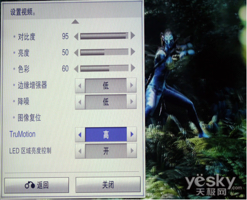LX9500的专业图像控制选项相当丰富:在图像调节的高级选项部分,提供了动态对比度强弱、动态色彩强弱、肤色校正、亮度基准调节、护眼功能、色域空间的选项,再加上400Hz TruMotion提供的“抖动”、“平滑”选项,以及FULL LED背光系有的“区域亮度控制”选项,全面而且详细。
