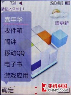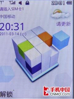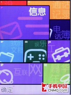 功能菜单联想S550设计的就可谓是别出心裁了。设计成了不规则的方块形,菜单分为四行,九个不规则矩形,配色也有所不同,看上去简洁时尚。同时,每个区块的功能单对应着一个数字按键,可以指向需要进入的功能。