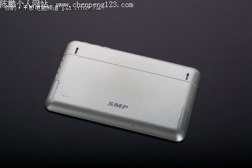 而反过来看则能看出一些不同的设计。首先整个平板的背部特别圆润,四边都采用圆滑的贝式处理,拿在手里的手感不错。这里也没有摩托罗拉的标记,仅有SMP字样,看来是上海公司的出品。