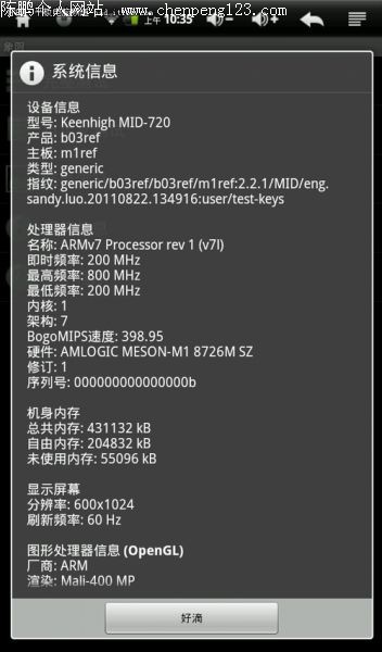 从系统信息可以看到,该平板采用了一颗800Mhz的ARM芯片,机身内存不到500MB(好在支持Micro SD卡扩展),屏幕分辨率为1024x600。这是一个比较常见的配置。