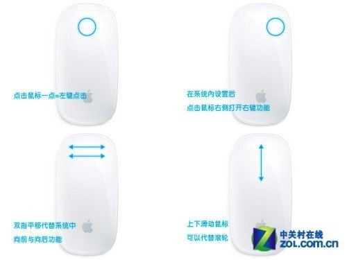 尽管Magic Mouse鼠标所宣称的功能很多,但是诸如下Ctrl然后划动滚轮进行页面缩放,或是按下鼠标可以拖动图片,都是依靠系统功能或是组合按键来完成的,实际 测试,Magic Mouse鼠标除具有传统鼠标的左右按键和上下滚轮下,还设计了“前进/后退”手势。基本可以完成系统默认的5键鼠标操作。