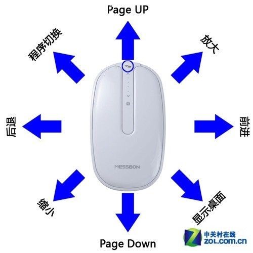 梅赛伯X1鼠标具有传统鼠标上的左右按键,中间的滚轮被触控区取代。触控区印有上下箭头的位置具有鼠标滚轮功能,单击下方印有“T”型符号的位 置,即可实际鼠标中键功能。按下触控滚轮前方的双箭头位置,同时移动鼠标,即可实际鼠标手势功能。梅赛伯X1鼠标可以跟据按下手势键后移动的8个方向,在不安装驱动的情况下实现多达8种常用功能,梅赛柏X1鼠标也是本次横评的四款鼠标中,唯一一款在不使用驱动调节的情况下具有鼠标中键功能的产品。