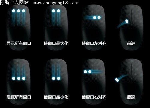 微软Touch Mouse鼠标所设计的八种手势,针对商务办公用户设计,通用性更强,使用更加便捷,操作更为流畅。除去单指在鼠标前端上下左右移动具有四向滚轮功能外, 还设计有双指的窗口左右对齐和最大/最小化。微软Touch Mouse鼠标还前所未有的将鼠标可识别触控点数增加到了3个。微软Touch Mouse鼠标尽管设计有驱动软件,但是功能相对较为有限