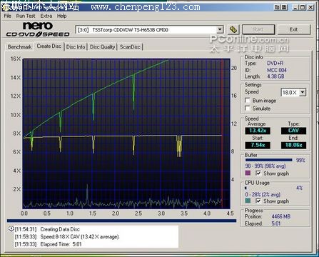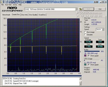 在DVD-R刻录评测中,我们首先使用了可超刻至20×的TDK DVD-R 16×刻录碟。但可能是因为兼容性的问题,TDK DVD-R 16×刻录碟仅能以最高18.13×的刻录速度完成刻录。