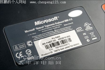 产品铭牌一览,除了标明了产品型号外,我们还可以看到“KU-0462”字样,从以往的经验来看,这极有可能是由台湾群光代工的一款键盘。此外,该键盘并没有设计漏水孔,不能保证防水性能。