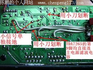 如图9,将小信号线接地点和2只TDA7265的第9脚,分别用单独的导线引出后,直接接主电源滤波电容的接地端。如此接地后,音箱的信噪比大为提高,就算耳朵紧贴扬声器,也几乎听不到任何噪音,宁静得如同关机一般。