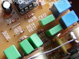 对照新旧版本N-35G的音调电路板(图12为旧版本、图13为新版本),会发现图13少了几个电容。经分析,新版本去掉了与功放电路板的耦合电容,改为直通,第二级运放也改为直流反馈,去掉了22uf的反馈电容。