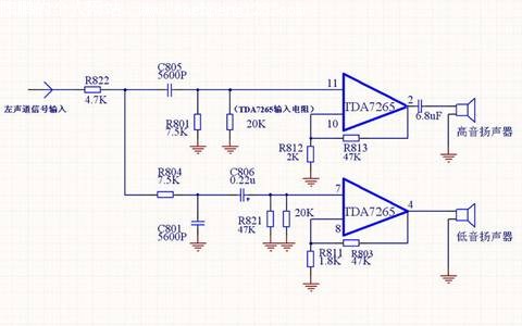 高音分频点:R=R822+(R801与TDA7265输入电阻并联后的阻值)=4.7K+5.5K=10.2K,TDA7265的输入电阻为20K,C=5600p,转折频率f=2786赫兹。