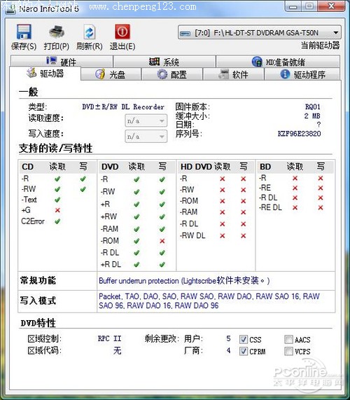 在测试平台上我们使用的是德国刻录大师NERO出品的Nero Disk Speed 5和Nero Info Tool 6,相信大家都比较熟悉,前者可以进行光盘抓轨、光盘刻录和刻录品质等测试并得出详细的参数及曲线图,后者主要用于检测光盘驱动器的相关信息。