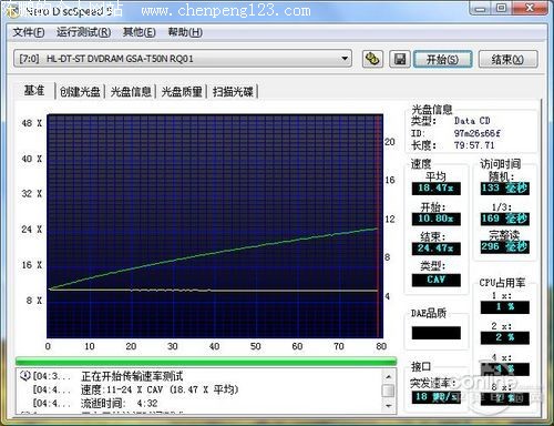 飚王 SED001超薄外置刻录机对CD-R的起始读取速度为10.80X,最高读取速度为24.47X,接口突发速率达到18MB/s,方式为CAV(恒定角速度),读取时比较顺利并且达到厂家的标称值。