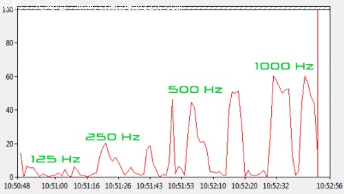 在125Hz时,CPU占用率非常低,但在250Hz和500Hz时,峰值已经接近40%,而在1000Hz时则达到了60%,我们是在非常密集的时间段内记录下这些数据的。1000Hz的回报率表现虽然完美,但我们建议,如果你的某个游戏需要非常多的快速移动,那么回报率最好不要超过500Hz。
