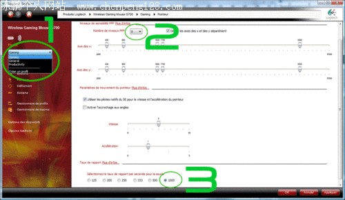 驱动界面给人印象一般,不过功能和设置非常全面。通过上图可以看到,区域1是三种宏定义模式的选择,每种模式中都能自定义足够多的功能。区域2是五种DPI分辨率档位,可以从200设定到5700DPI。我们设计了400/800/1200/1600四档。区域三是回报率。
