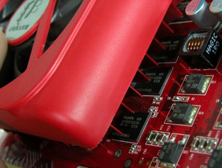 配备了 hynix 高速 1.4ns GDDR3 显存,正面八颗显存颗粒组成 256MB/256Bit 规格,提供 19.2GB/s 的显存带宽,满足 HDR + AA 模式下的带宽要求,核心 / 显存默认频率为 500MHz/1200MHz ,显存还有一定的提升空间。