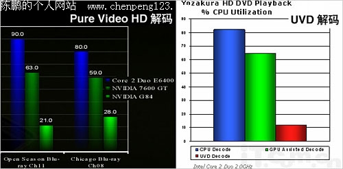 以前我们总是说ATi的视频画质如何超群,那个只是建立在SDTV(标清视频)上。而在高清晰视频领域,除了考验画质之外,更多的是考验其更低的CPU占用率,上图给出了NVIDIA和ATi在视频解码方面的CPU占用率对比,我们可以看到,无论是NVIDIA宣扬的PureVideo HD还是ATi宣扬的UVD格式,在播放码率达到30Mbps以上视频流时候,都能以极低的CPU占用率稳定播放,究竟,他们又是如何工作的?哪个优势更为明显?