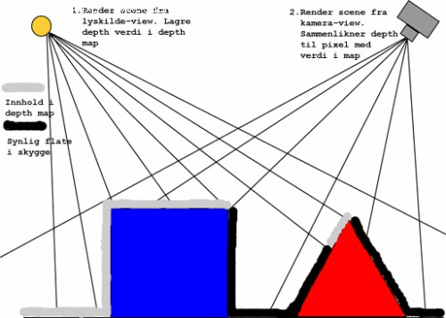 Shadow Mapping是一种基于阴影映射图的阴影生成方法。其原理是先以光源为视点对场景进行渲染,得到一副所有可渲染物体相对于光源的Shadow Map(也叫depth map),在这幅Shadow Map中所有的像素值的灰度(Shadow Map图本身的像素只有灰度值,也就是说他是一幅黑白图)不代表颜色,而是代表他相对于光源的距离。然后在以原来的视点渲染整个场景并计算每个像素到光源的距离,通过将这个距离与刚才得到的Shadow Map中记录的距离相比对,从而得出这个物体是不是在阴影中的结果,然后根据结果采用不同的光照渲染。这种方法比较容易理解但是其缺点就是在有动态光源出现的场景中效率非常低下,因为每次光源移动都需要重新计算新的Shadow Map,而只要光源不发生位移,那么以前生成的Shadow Map就可以重复使用。所以这种技术通常用于静态光源比较多的场景中。而且这种方法除了处理移动光源时效率低下之外,其另外一个重大的缺陷就是其阴影的锯齿问题。其主要原因是,在很多情况下以光源为视点所生成的Shadow Map包含太多物体而且这张Shadow Map的分辨率不够,所以造成每个物体的阴影边缘会产生很多锯齿。要解决这种问题,有两个方法可供选择,一是增大Shadow Map的分辨率,二是采用更精确的以光源为视点的生成Shadow Map的方法;由于Shadow Mapping算法的本身将消耗大量的计算资源,所以第一种方法显然在效率上是不可取的。人们开发了新的以光源为视点的算法,用以生成更精确的Shadow Map。其方法是设法在不降低分辨率和造成阴影失真的情况下设法拉近光源视点相对阴影物件的距离。其效果我们可以在下图中看到。