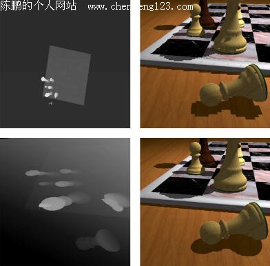 左下图是用改进的透视方法生成Shadow Map(同样是以光源为视点)。右下图是以左下图为基础生成的最终渲染效果(阴影相对上面好了很多)。
