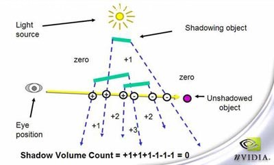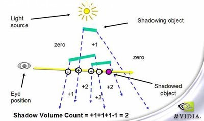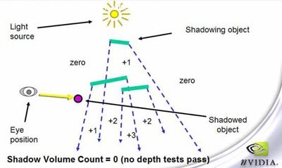 具体方法是对从视点到物体引一条直线,并对这条直线进行赋Stencil值,当直线进入一个阴影锥时Stencil值就加一,当直线从一个阴影锥中出来时Stencil值就减一。那么如果这条直线最后的值为0那么说明物体不在阴影中。